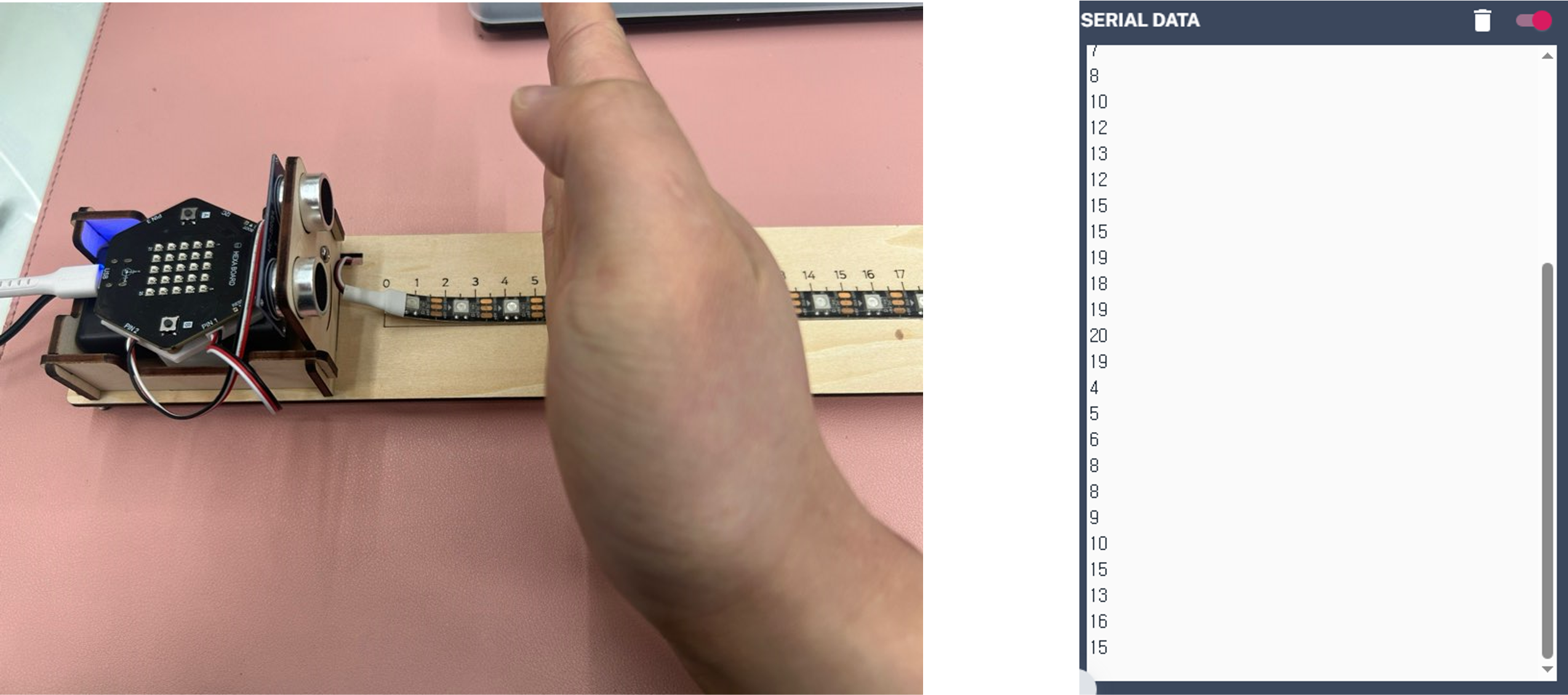 · 동시에 초음파 센서로 거리값을 측정하고, 단위를 mm에서 cm로 변환합니다.