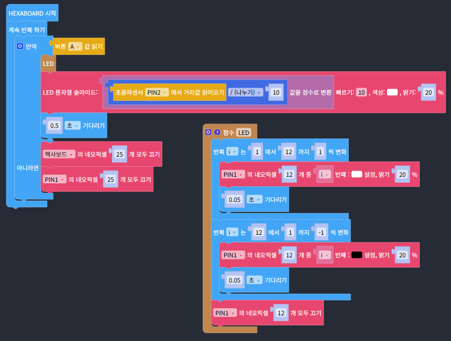 · LED 함수는 LED 12개를 앞에서부터 차례로 켠 후, 다시 뒤에서부터 차례로 끄는 애니메이션 효과를 만들어줍니다.