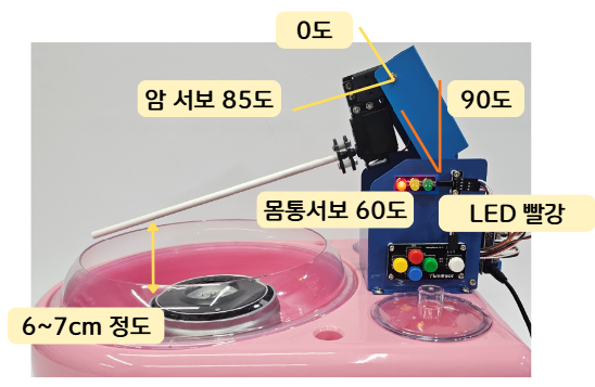 -. 솜설탕이 핫도그 정도 크기가 되면, 각도(서보모터1/ 몸체에 연결된)를 60초 동안 조금씩 올려 더 크게 만들기