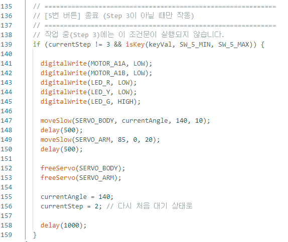 1 2 3 4 5 6 7 8 9 10 11 12 13 14 15 16 17 18 19 20 21 22 23 24 25 26 27 28 29 30 31 32 33 34 35 36 37 38 39 40 41 42 43 44 45 46 47 48 49 50 51 52 53 54 55 56 57 58 59 60 61 62 63 64 65 66 67 68 69 70 71 72 73 74 75 76 77 78 79 80 81 82 83 84 85 86 87 88 89 90 91 92 93 94 95 96 97 98 99 100 101 102 103 104 105 106 107 108 109 110 111 112 113 114 115 116 117 118 119 120 121 122 123 124 125 126 127 128 129 130 131 132 133 134 135 136 137 138 139 140 141 142 143 144 145 146 147 148 149 150 151 152 153 154 155 156 157 158 159 160 161 162 163 164 165 166 167 168 169 | /* [솜사탕 로봇 메인 컨트롤러] */ #include "CottonServo.h" // --- [1] 핀 번호 설정 --- #define LED_R 9 // 빨간 불 (작업 중) #define LED_Y 10 // 노란 불 (자동 키우기) #define LED_G 11 // 초록 불 (대기/완료) #define MOTOR_A1A 5 // DC 모터 (솜사탕 기계 회전) #define MOTOR_A1B 6 #define KEYPAD_PIN A0 // 5버튼 키패드 // 서보 모터 채널 (PCA9685) #define SERVO_BODY 0 // 몸체에 연결된 서보 #define SERVO_ARM 1 // DC모터와 연결된 서보 // 버튼 아날로그 값 범위 #define SW_1_MIN 0 // [1단계] 작업 시작 #define SW_1_MAX 10 #define SW_2_MIN 140 // [수동] 각도 올리기 #define SW_2_MAX 150 #define SW_3_MIN 325 // [수동] 각도 내리기 #define SW_3_MAX 336 #define SW_4_MIN 502 // [2단계] 자동 키우기 #define SW_4_MAX 513 #define SW_5_MIN 736 // [종료] 초기화 #define SW_5_MAX 747 // --- [2] 전역 변수 --- int currentStep = 2; // 현재 단계 (2: 대기, 3: 작업중, 4: 수동/완료) int currentAngle = 140; // 팔의 현재 각도 // --- [3] 편의 함수 --- bool isKey(int val, int min, int max) { return (val >= min && val <= max); } // --- [4] 초기 설정 (setup) --- void setup() { Serial.begin(9600); initServo(); pinMode(LED_R, OUTPUT); pinMode(LED_Y, OUTPUT); pinMode(LED_G, OUTPUT); pinMode(MOTOR_A1A, OUTPUT); pinMode(MOTOR_A1B, OUTPUT); // 초기 상태: 초록불, 모터 끔 digitalWrite(LED_G, HIGH); digitalWrite(MOTOR_A1A, LOW); digitalWrite(MOTOR_A1B, LOW); Serial.println("--- 솜사탕 로봇 부팅 완료 ---"); // 초기 위치 복귀 및 힘 풀기 moveSlow(SERVO_BODY, 90, 140, 25); delay(500); moveSlow(SERVO_ARM, 45, 0, 20); delay(500); currentAngle = 140; delay(1000); freeServo(SERVO_BODY); freeServo(SERVO_ARM); Serial.println(">> 대기 모드 (버튼 1을 눌러 시작하세요)"); } // --- [5] 메인 루프 (loop) --- void loop() { int keyVal = analogRead(KEYPAD_PIN); // ============================================================ // [1번 버튼] 작업 시작 (Step 2 -> 3) // ============================================================ if (currentStep == 2 && isKey(keyVal, SW_1_MIN, SW_1_MAX)) { Serial.println(">> 작업 시작! (5번 버튼 잠금됨)"); digitalWrite(LED_G, LOW); digitalWrite(LED_R, HIGH); moveSlow(SERVO_ARM, 0, 85, 20); delay(500); moveSlow(SERVO_BODY, 140, 60, 10); delay(1000); currentAngle = 60; digitalWrite(MOTOR_A1A, HIGH); // 기계 회전 시작 currentStep = 3; delay(500); } // ============================================================ // [4번 버튼] 자동 키우기 (Step 3 -> 4) // ============================================================ if (currentStep == 3 && isKey(keyVal, SW_4_MIN, SW_4_MAX)) { Serial.println(">> 자동 키우기 시작..."); digitalWrite(LED_R, LOW); digitalWrite(LED_Y, HIGH); while (currentAngle < 80) { currentAngle += 2; if (currentAngle > 180) currentAngle = 180; setAngle(SERVO_BODY, currentAngle); Serial.print("자동 진행 중.. 각도: "); Serial.println(currentAngle); // 솜사탕이 감길 시간 (작업 중엔 5번 버튼 무시) delay(6000); } Serial.println(">> 자동 작업 완료! 이제 종료가 가능합니다."); digitalWrite(LED_Y, LOW); digitalWrite(LED_G, HIGH); currentStep = 4; // 드디어 완료 단계로 진입 } // ============================================================ // [2, 3번 버튼] 수동 조절 (Step 4에서만 가능) // ============================================================ if (currentStep == 4) { if (isKey(keyVal, SW_2_MIN, SW_2_MAX)) { if (currentAngle < 180) { currentAngle++; setAngle(SERVO_BODY, currentAngle); delay(100); } } if (isKey(keyVal, SW_3_MIN, SW_3_MAX)) { if (currentAngle > 0) { currentAngle--; setAngle(SERVO_BODY, currentAngle); delay(100); } } } // ============================================================ // [5번 버튼] 종료 (Step 3이 아닐 때만 작동) // ============================================================ // 작업 중(Step 3)에는 이 조건문이 실행되지 않습니다. if (currentStep != 3 && isKey(keyVal, SW_5_MIN, SW_5_MAX)) { Serial.println(">> 종료 및 원위치 복귀"); digitalWrite(MOTOR_A1A, LOW); digitalWrite(MOTOR_A1B, LOW); digitalWrite(LED_R, LOW); digitalWrite(LED_Y, LOW); digitalWrite(LED_G, HIGH); moveSlow(SERVO_BODY, currentAngle, 140, 10); delay(500); moveSlow(SERVO_ARM, 85, 0, 20); delay(500); freeServo(SERVO_BODY); freeServo(SERVO_ARM); currentAngle = 140; currentStep = 2; // 다시 처음 대기 상태로 Serial.println(">> 초기화 완료 (대기 모드)"); delay(1000); } } | cs |