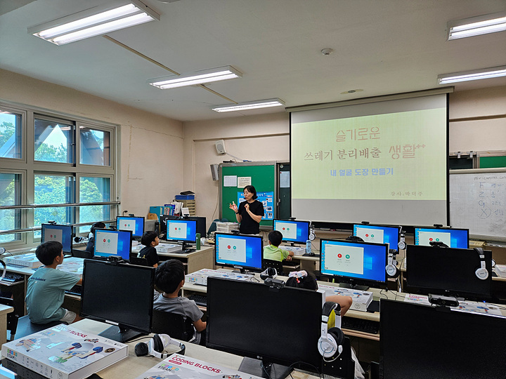2023년 8월 17일 서울영희초등학교에서 아!(AI)놀자 여름 캠프를 5개 부문으로 나누어 진행하였습니다.1. '지구 지킴이' 나의 도장 만들기 : ‘지구를 지키는 나’를 주제로 한 내 얼굴이 들어간 나만의 도장 만들기2. 언플러그드 코딩 로봇 ‘VINU(비누)’ : 기울기로 센서 로봇으로 미션 수행하기
