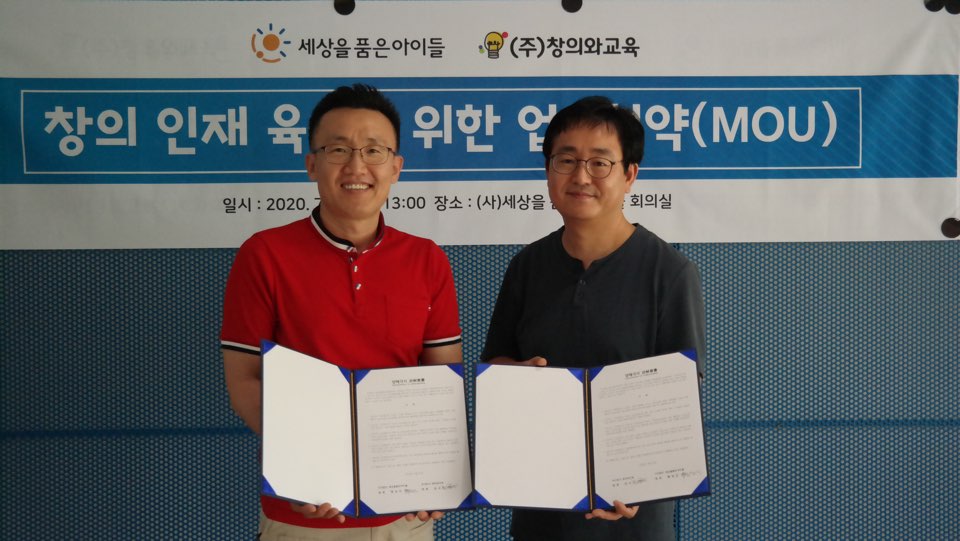 2020년 7월 27일 (주)창의와교육과 (사)세상을품은아이들의 업무협약식이 있었습니다.