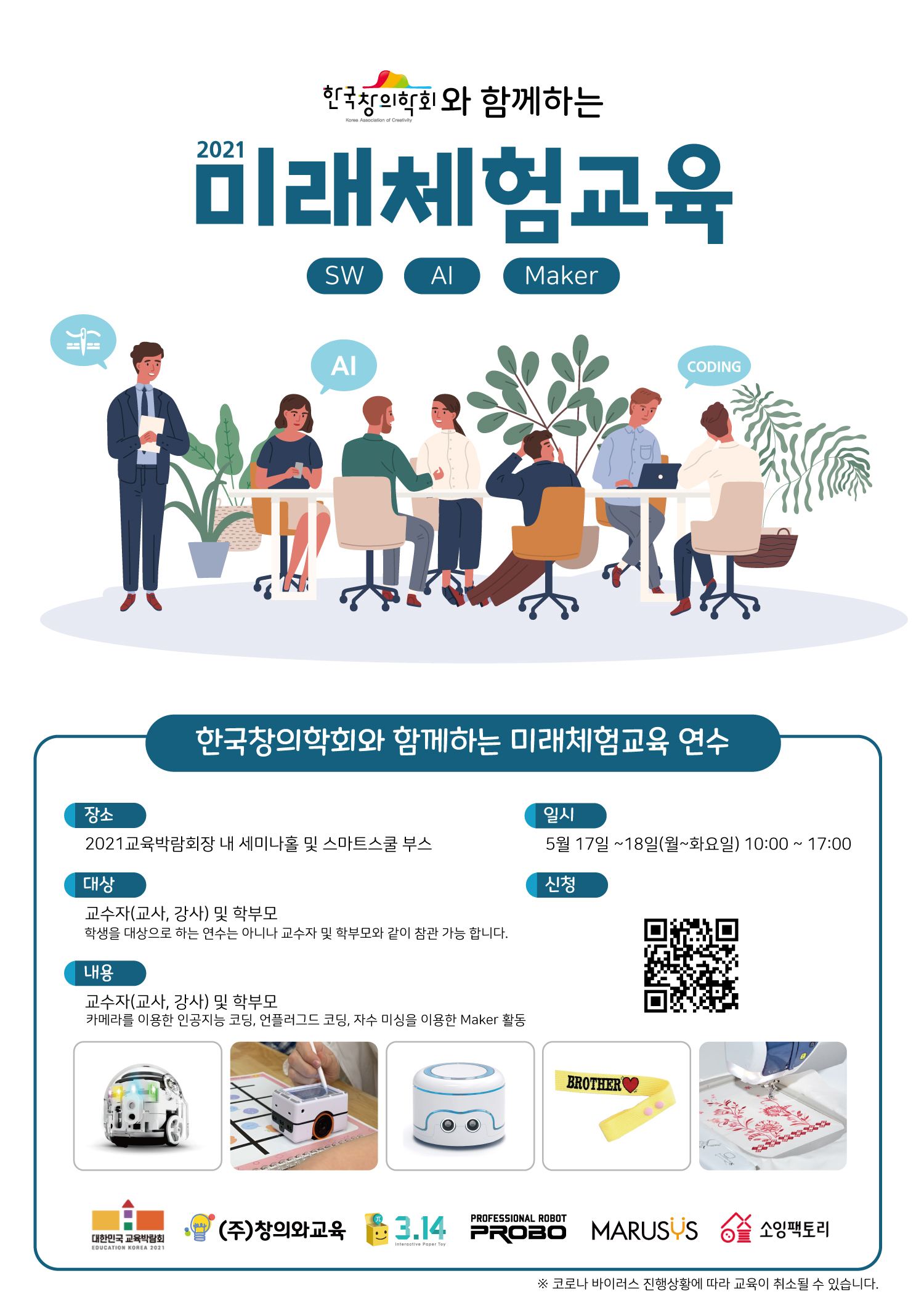 (주)창의와교육은 2021 대한민국 교육박람회 (서울 코엑스)에서 한국창의학회와 (주)삼쩜일사, (주)프로보에듀, (주)마르시스에듀, 소잉팩토리, 교육박람회사무국과 함께 SW, AI, Maker 교육 연수를 진행합니다.