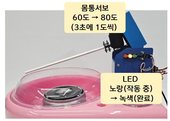-. 솜설탕이 핫도그 정도 크기가 되면, 각도(서보모터1/ 몸체에 연결된)를 60초 동안 조금씩 올려 더 크게 만들기