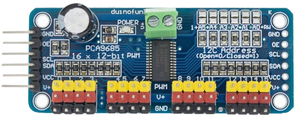 이러한 문제를 해결하기 위해 PCA9685 서보 드라이버 모듈을 사용합니다.