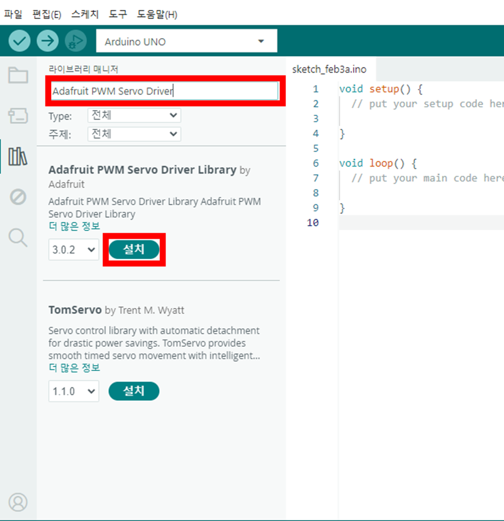 1 2 3 4 5 6 7 8 9 10 11 12 13 14 15 16 | #include <Servo.h> Servo servo1; Servo servo2; void setup() { servo1.attach(3); // 서보모터 1 servo2.attach(4); // 서보모터 2 servo1.write(90); servo2.write(90); } void loop() { } | cs |